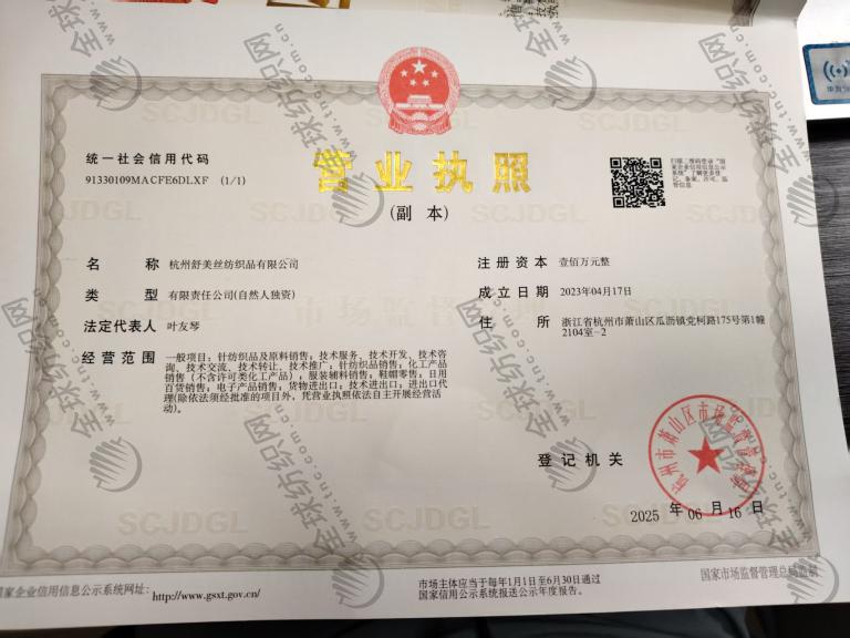 | 统一社会信用代码/营业执照注册号: | 91330109MACFE6DLXF | 名称: | 杭州舒美丝纺织品有限公司 |